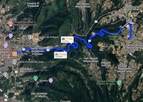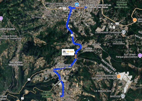 Punto de partida: Centro Comercial Las Puertas San Lucas, ubicado en el kilómetro 29.5 de la Carretera Interamericana, San Lucas Sacatepéquez .