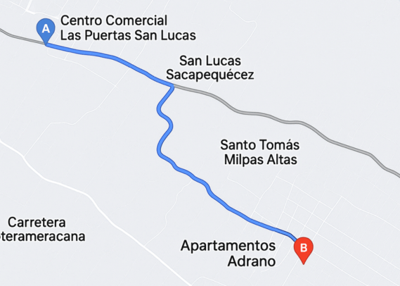 - Salida del centro comercial: Al salir de Las Puertas San Lucas, incorpórate a la Carretera Interamericana (CA-1) en dirección oeste hacia Antigua Guatemala.